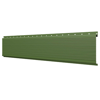 Линеарная потолочно-стеновая панель РИФЛЕНАЯ усиленная цвет RAL6002 Зеленый Лист применяется в качестве софитов для подшивы крыши, наружной и внутренней отделки потолков, стен, фронтонов фасада дома в Хабаровске.