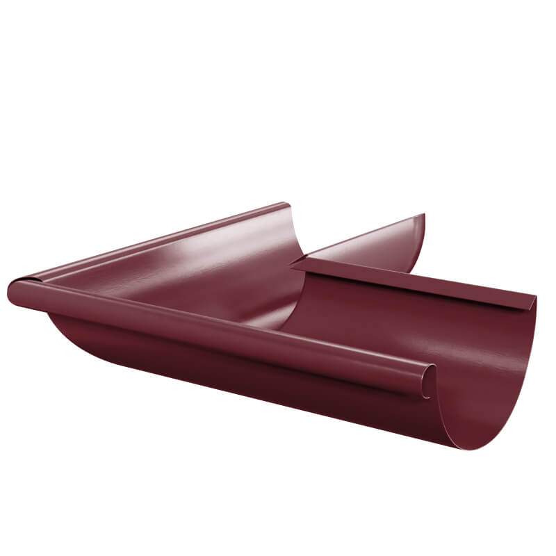 Угол желоба водостока наружный 90 градусов d125мм RAL 3005 Красное Вино металлический - используется для надежного сопряжения двух желобов между собой на углах 90 градусов карниза кровли. Угол желоба изготовлен без сварных сопряжений, методом прессования (глубокая вытяжка), что придает ему дополнительную коррозийную и механическую стойкость.